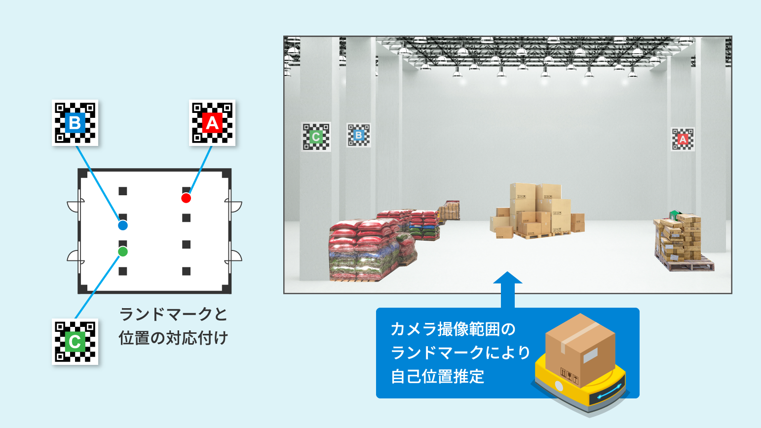 「Landmark based SLAM」は、事前にランドマークの位置情報を環境地図に登録しておきます。カメラでこのランドマークを認識して自己位置を推定します。更に「Visual SLAM」で割り出した自己位置と組み合わせていることで自己位置の累積誤差を補正して、正確性を高めます。2つの技術を組み合わせることで、少ないランドマークでも自己位置を推定できるのが特徴です。