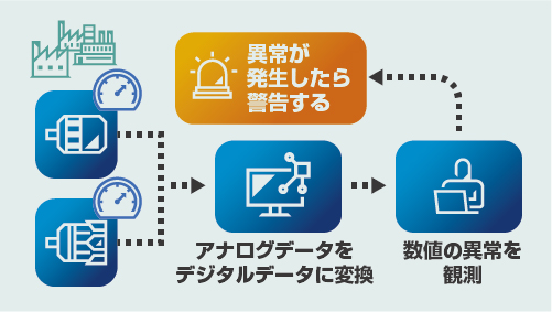 アナログメーターをセンサーで読み取り、デジタルデータとして収集します。それにより、現場での手書きの点検記録が不要になり、ヒューマンエラーの防止と異常検知が容易になります。
