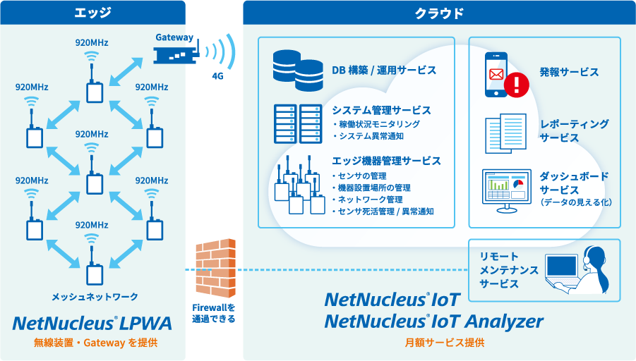 施設監視ソリューションとは、既存施設にセンサを配置し、当社開発の「省電力無線メッシュネットワーク」および「クラウドサービス」と連携させることで、データ収集および分析、見える化を容易に実現できるソリューションです。「省電力無線メッシュネットワーク」に使用する当社製の無線機は、メッシュネットワークを構成し接続するため、広域な施設監視システムの構築にも適しています。さらに、電池で駆動するため、複雑なインフラ工事を必要とせず簡単に設置可能です。また、「クラウドサービス」は、必要事項を記載したExcelシートを読み込ませるだけで設定可能なため、簡単にIoTシステムを構築できます。