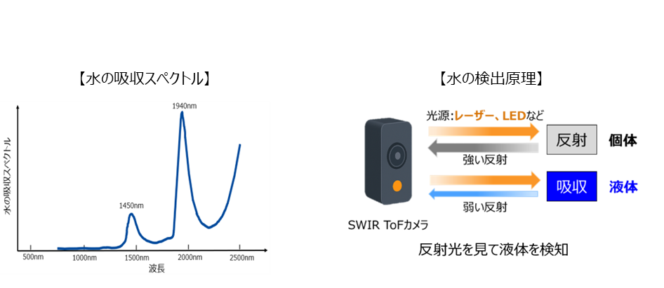 Liquidseekerは、特定の波長光で水が光を吸収する原理を利用し検知を行っています。LiquidseekerとSWIR ToFカメラ「漏水・薬液検知 SWIR 3Dカメラ」を組み合わせることで、液体を非接触で検知することができます。