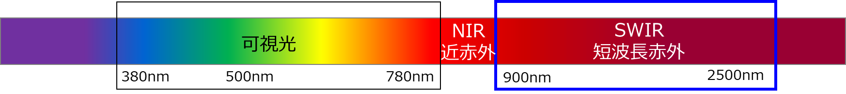 SWIR(スワイア:短波長赤外)とは、一般的に0.9μm(=900nm)から2.5μm(=2,500nm)の波長帯をいいます。