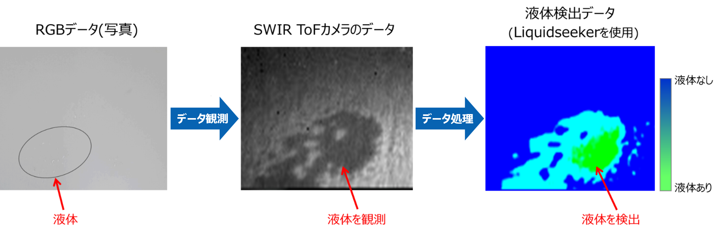 Liquidseeker(リキッドシーカー)は、SWIR(短波長赤外)の波長帯を利用し、非接触での液体検知を実現するアルゴリズム(ソフトウェアIP)です。 本IPを適用条件を満たしたToFカメラに組込むことにより液体の漏れやにじみ、水分を含んだ粒子を検知がすることが可能になります。